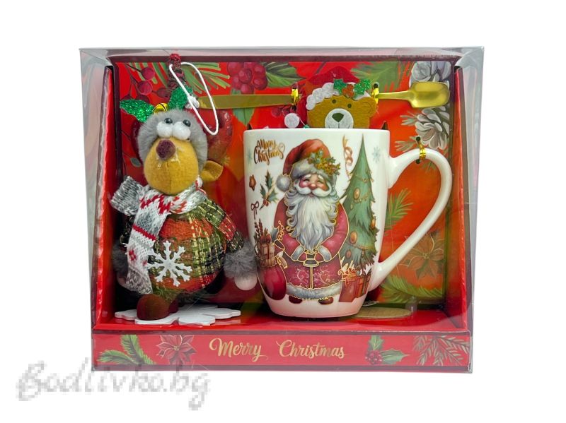 Внесете коледно настроение с този очарователен комплект! Голяма коледна чаша, украсена с празнични мотиви, придружена от сладка играчка и лъжичка с коледен мотив.