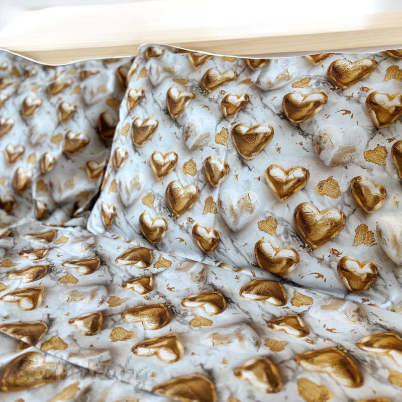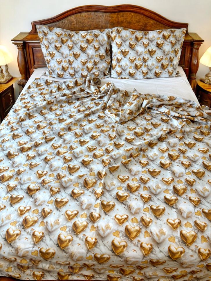 Технологията на дигиталния 5D принт позволява да се създадат невероятно реалистични и детайлни изображения върху плата. Златните сърца сякаш оживяват върху спалното бельо, придавайки му триизмерен ефект и усещане за лукс.