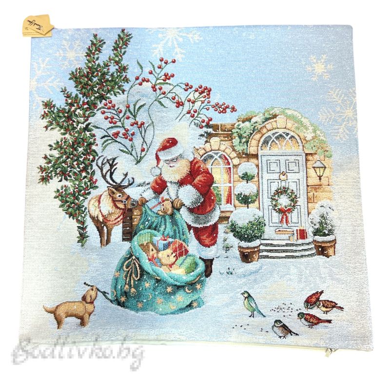 Калъфката разполага с топъл и жив дизайн, включващ Дядо Коледа, който се е заел да достави подаръци. Изображението е богато на детайли, включва снежен човек, заобиколен от зимни пейзажи и елементи, които вдъхват живот на коледната магия. С топли цветове и празнична атмосфера, тази калъфка ще се превърне в любим акцент във вашия дом по време на празниците.