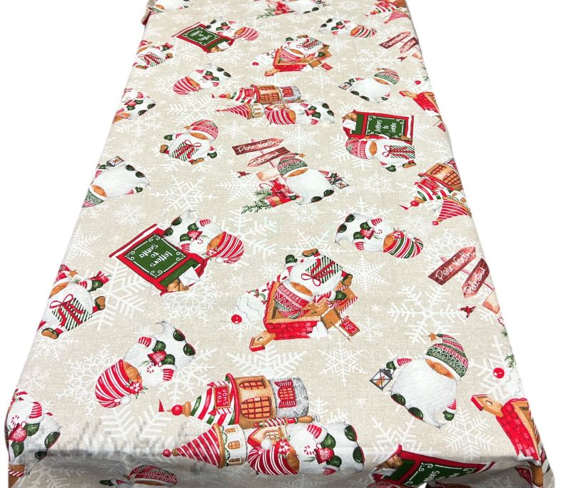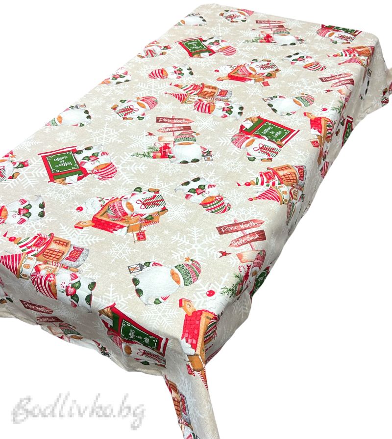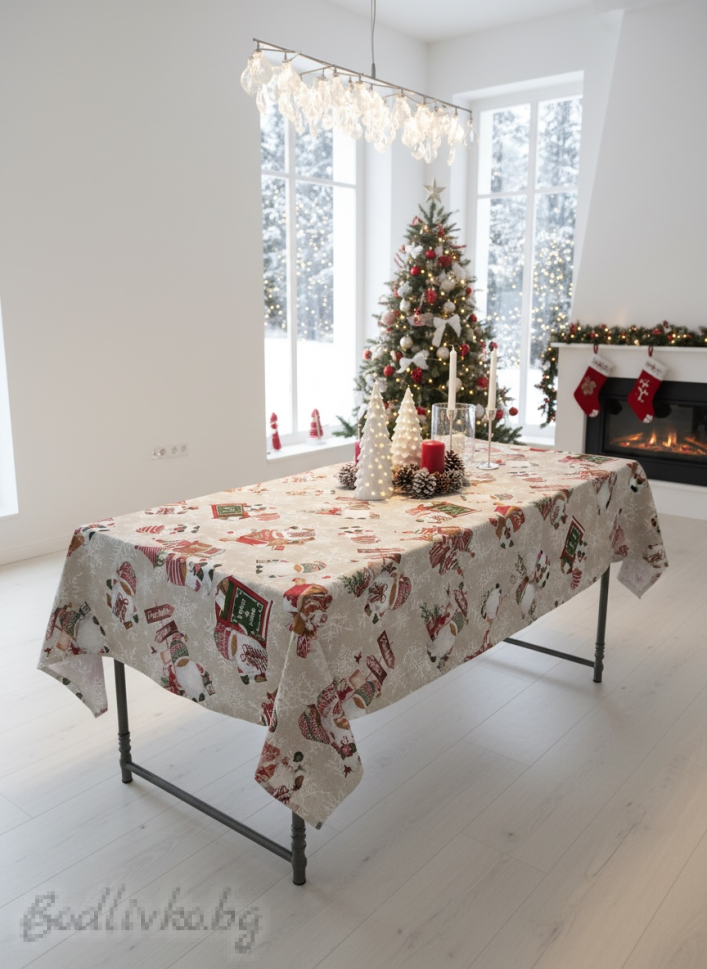 Ето едно празнично допълнение към вашата коледна украса! Представяме ви нашата очарователна коледна покривка за маса с коледни гномчета!