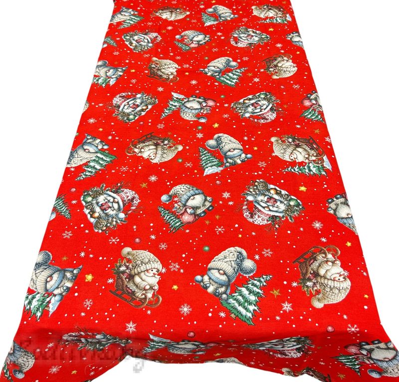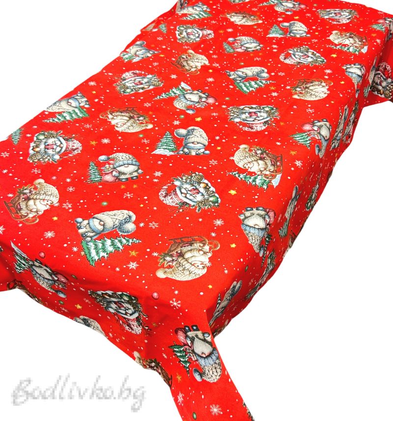 Покривката е с ярък и весел червен цвят, който е символ на топлина и радост. Тя е украсена с очарователни коледни мотиви - усмихнати Дядо Коледовци, снежни човеци и празнични шапки. Този дизайн ще внесе много настроение и празничен дух във вашия дом.