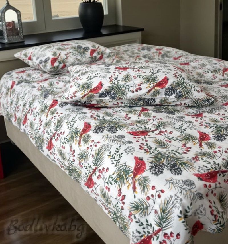 Коледен спален комплект "КОЛЕДНИ ПТИЧКИ В ГОРАТА", с два плика, 100% ПАМУК/РАНФОРС, 5 ЧАСТИ