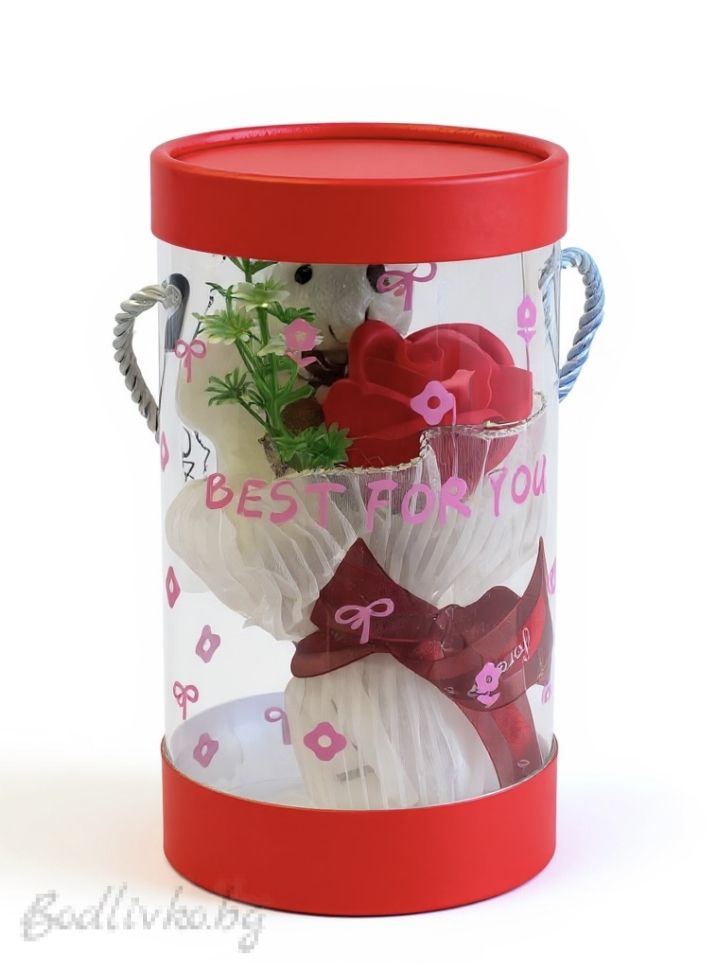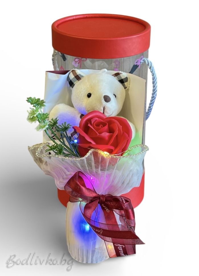 - Очарователно мече: Меко и пухкаво мече, което допълва нежността на розата и прави подаръка още по-мил и привлекателен.