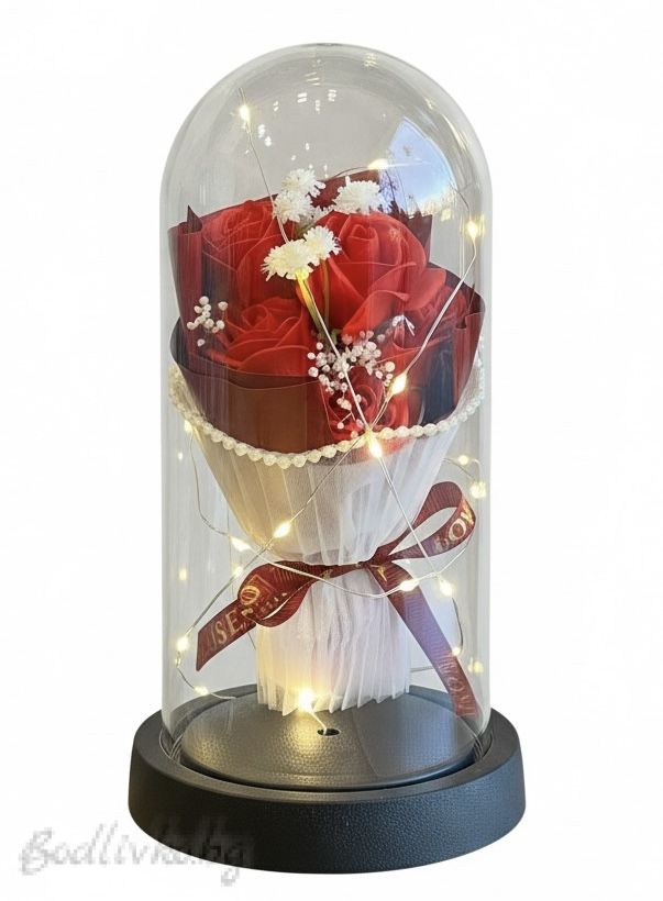 Елегантен дизайн: Този зашеметяващ букет е умело подреден в стъклен купол, създавайки вечна и елегантна визия. Интензивните червени рози са заобиколени от деликатни бели цветя, умело аранжирани, за да очароват.
