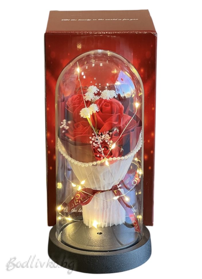 Светещ букет от рози в стъкленица - Вечна красота, 22 см