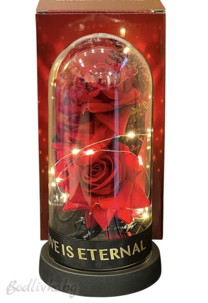 Представяме ви елегантна стъклена купол, съдържаща три изящни червени рози, заобиколени от фини светещи LED светлини. Тази магическа композиция е поставена върху стилна черна основа с надпис "Love is Eternal" (Любовта е вечна), което я прави идеалният подарък за любим човек.