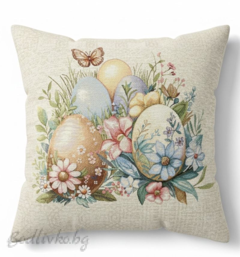 Внесете пролетно настроение във вашия дом с нашата очарователна калъфка за възглавничка "Яйца и пеперудка"!