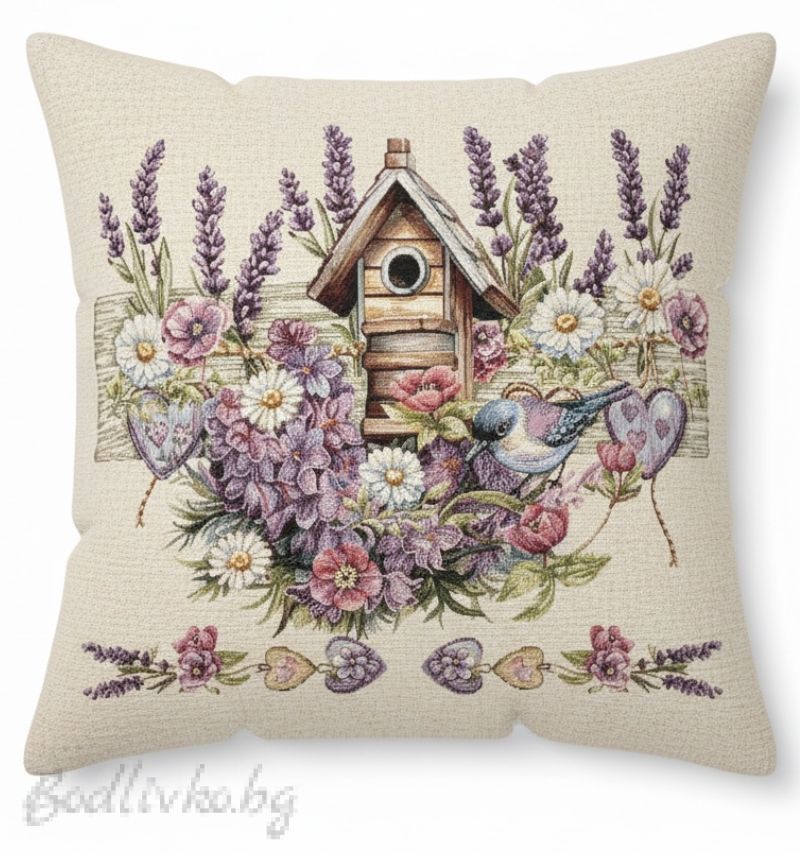* Размер: 45/45 см - идеален размер за декоративни възглавнички, които да добавят стил и комфорт към вашия диван, легло или любим стол. * Дизайн: Вдъхновен от лавандуловата романтика, дизайнът включва нежни цветове и детайлни рисунки на лавандула, цветя, къщичка за птички и малка птичка, които създават усещане за спокойствие и хармония. * Материал: Висококачествен полиестер, който е мек на допир, издръжлив и лесен за поддръжка. * Закопчаване: Скрит цип, който осигурява лесно поставяне и сваляне на калъфката, както и елегантен външен вид.