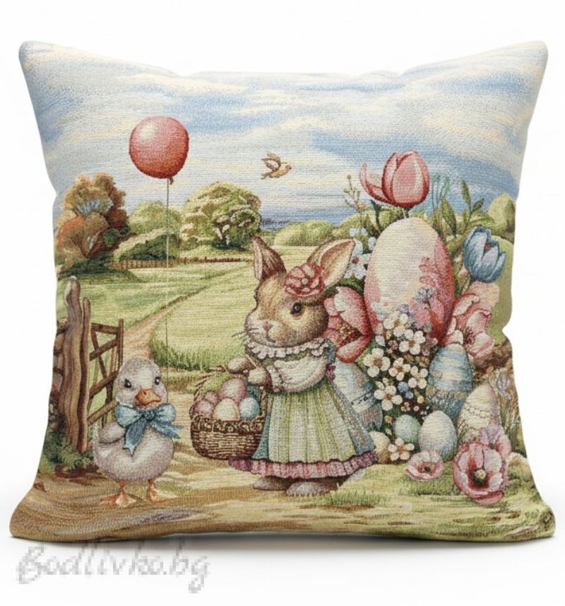 Калъфката е с размери 45/45 см и е изработена от висококачествени материали, които осигуряват мекота и дълготрайност. Изображението е детайлно и ярко, представящо симпатична зайка с кошница пълна с великденски яйца, заобиколена от цветя и други великденски символи. Този дизайн е перфектен за създаване на топла и уютна атмосфера в дома ви.