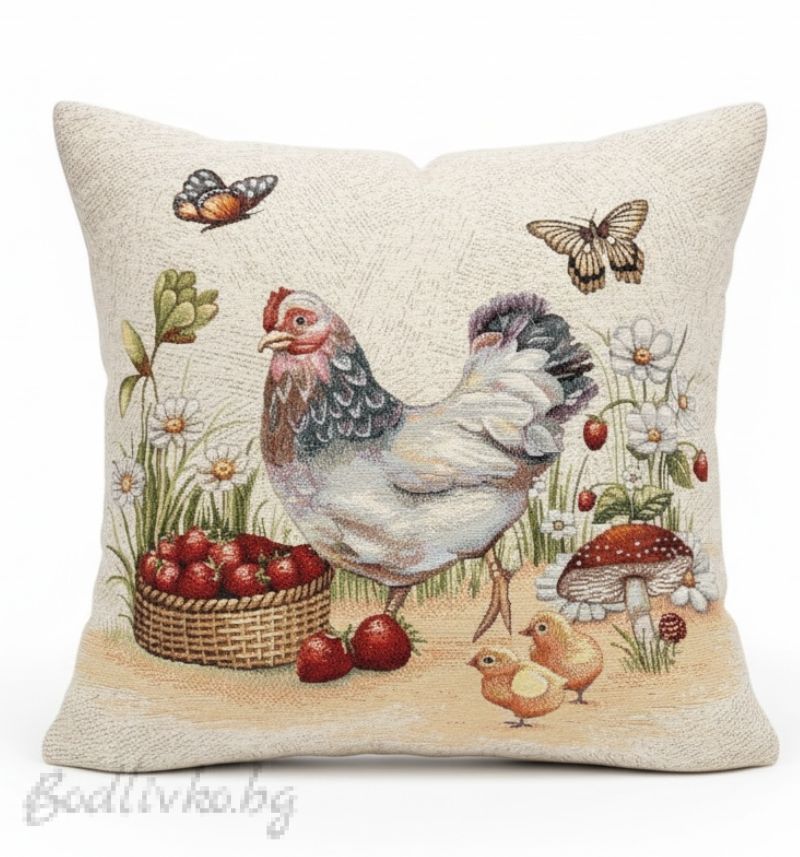 Калъфката е изработена с внимание към детайла, като изобразява живописна сцена с кокошка, заобиколена от диви цветя, пеперуди и гъбки. Кошница с ягоди и малки пиленца допълват идиличната картина, която ще стопли сърцето ви.