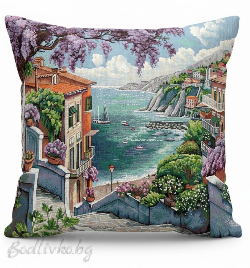 КАЛЪФКА за възглавничка, Пейзаж от морето в лилаво, 45/45см. - ОЧАКВАНА ДОСТАВКА