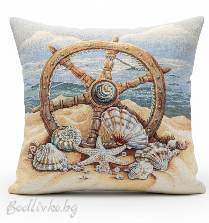 Тази красива калъфка за възглавница, с размери 45/45 см, е истинско произведение на изкуството, което пренася морската атмосфера директно във вашия хол или спалня. Вдъхновена от красотата на морето, тя изобразява класически корабен рул, заобиколен от миди и морски звезди на пясъчен плаж. Меките цветове и реалистичните детайли създават усещане за спокойствие и релакс.