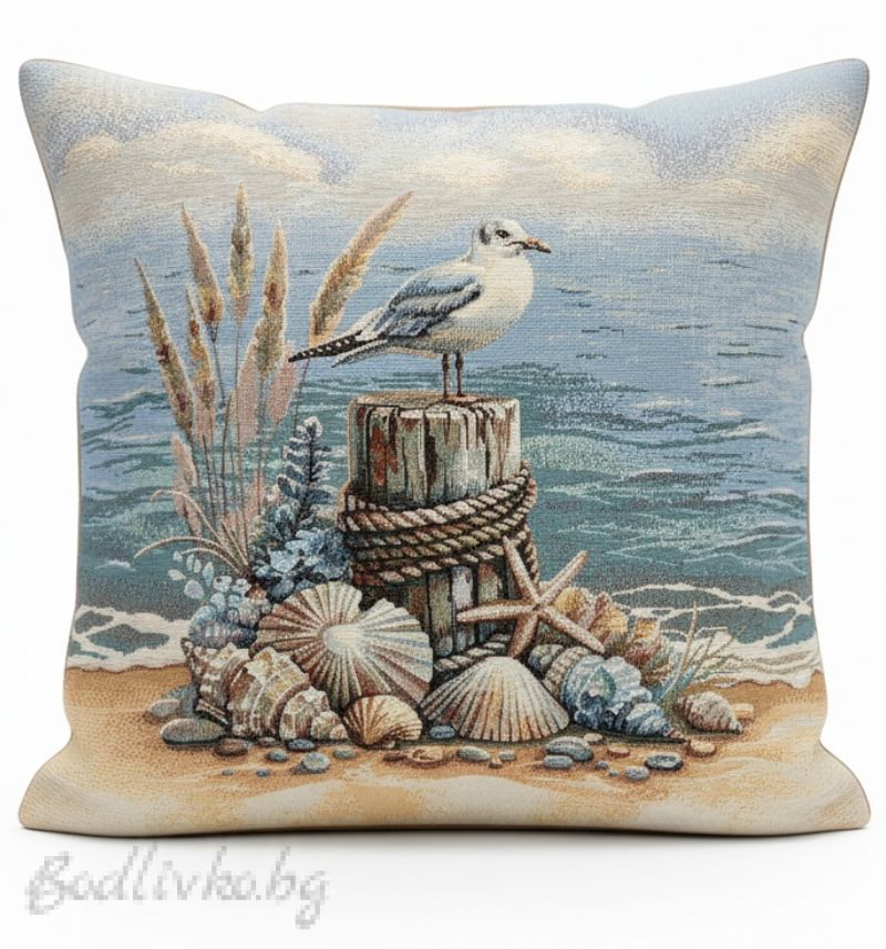 Дизайн, вдъхновен от морето: Изображението на калъфката пресъздава красива морска сцена с грациозен гларус, кацнал на стар дървен стълб, обвит с въже, заобиколен от миди и морски звезди, разположени на пясъчен бряг, с нежно синьо море на заден план. Детайлите са прецизни и създават усещане за спокойствие и релакс, сякаш сте на самия морски бряг.