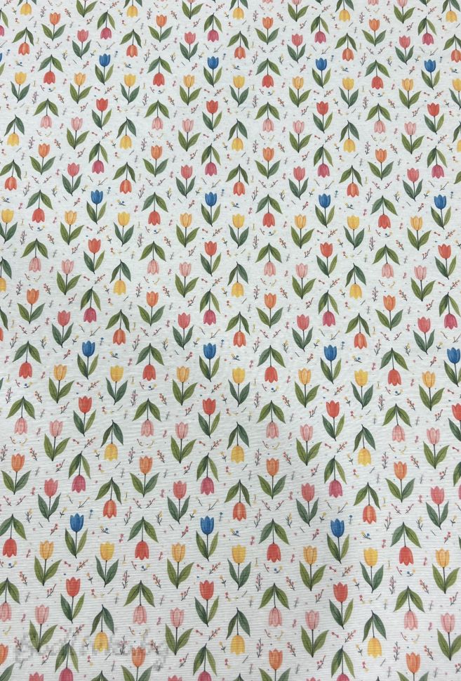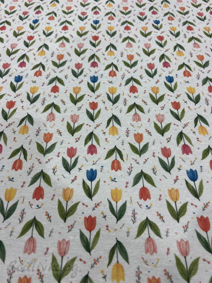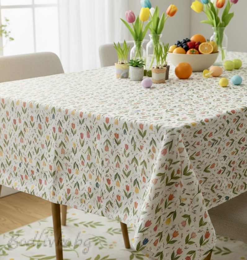 Изработена от висококачествен испански плат лонета, тя е здрава, устойчива и лесна за поддръжка. Десенът с нежни, многоцветни лалета върху светъл фон придава пролетна лекота и уют на всяко пространство – идеална за ежедневна употреба и празнична декорация.
