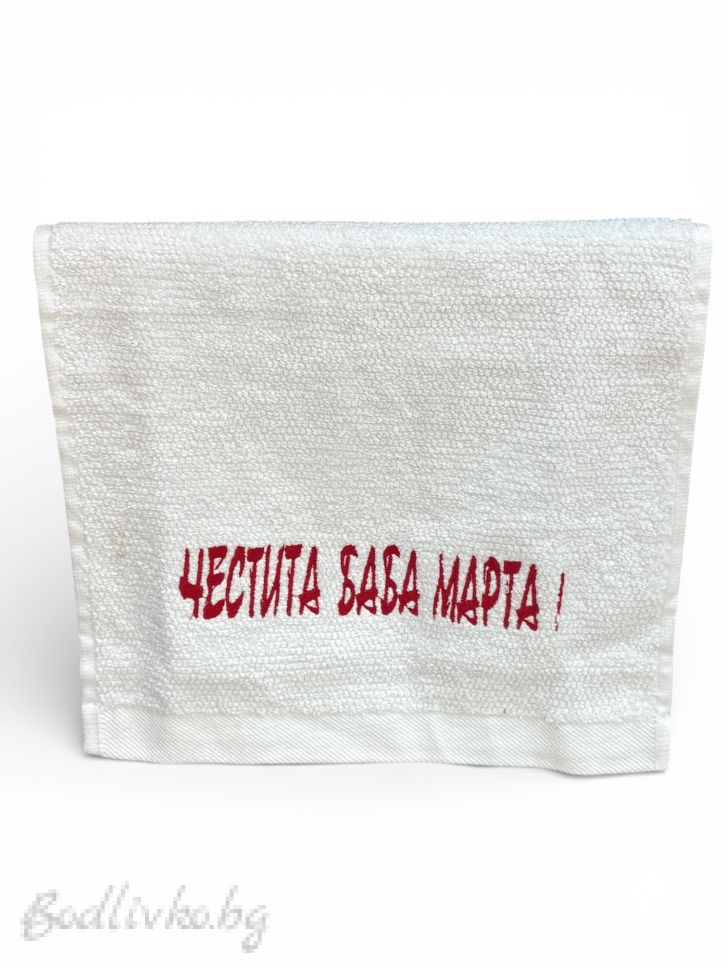 Бродирана хавлия с надпис „Честита Баба Марта“, подходяща за празничен подарък.