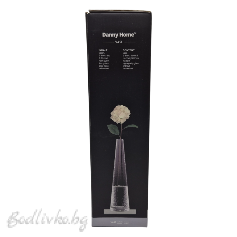 Стъклената ваза Danny Home с размери 3 х 8.5 х 32 см впечатлява със своята изчистена, издължена форма и елегантен силует. Височината от 32 см я прави идеална за дълги цветя, декоративни клонки или минималистични аранжировки.
