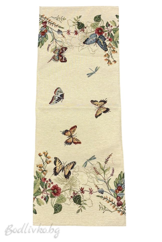Жакардов тишлайфер с нежни пеперуди и флорални мотиви.
